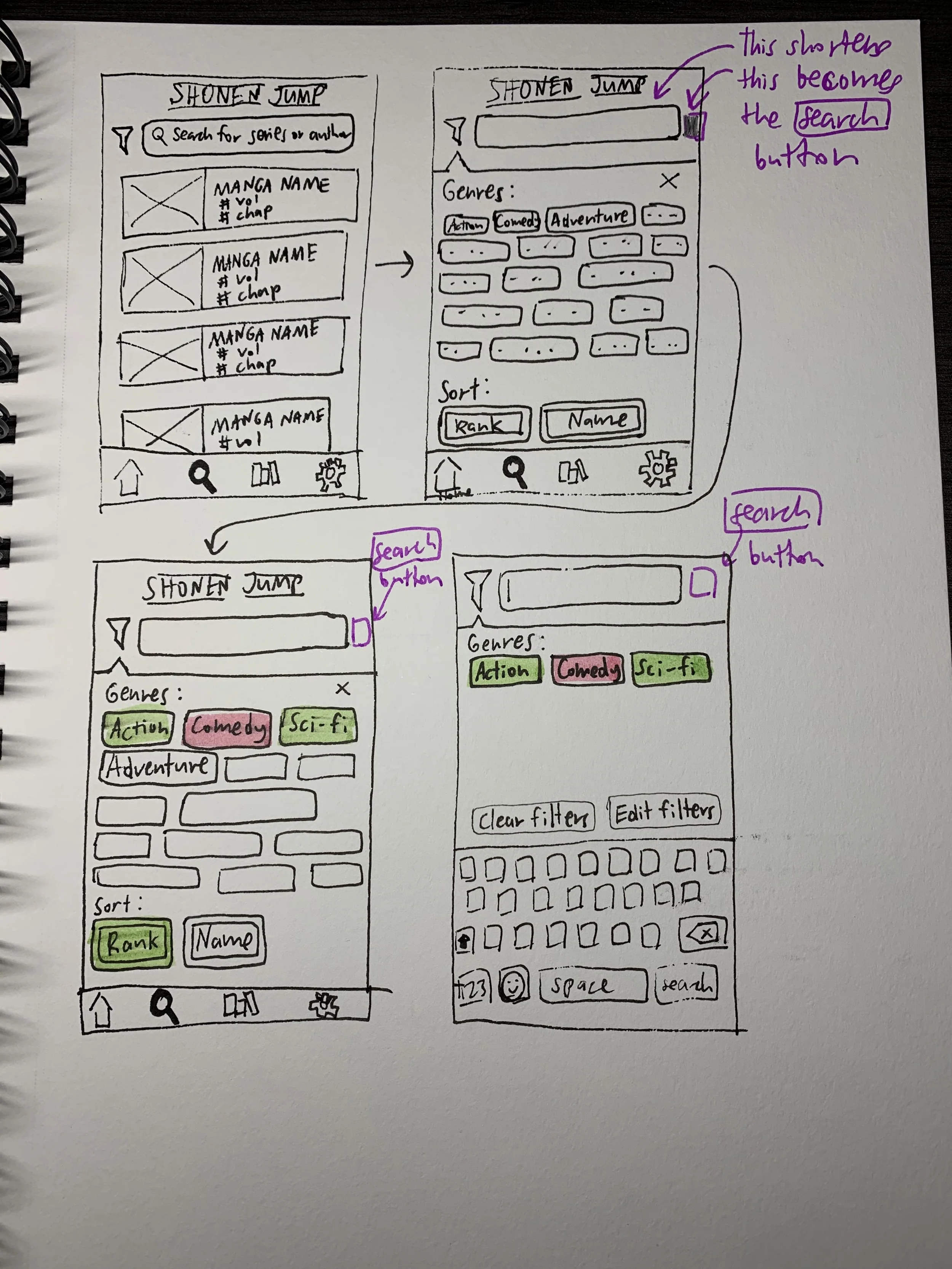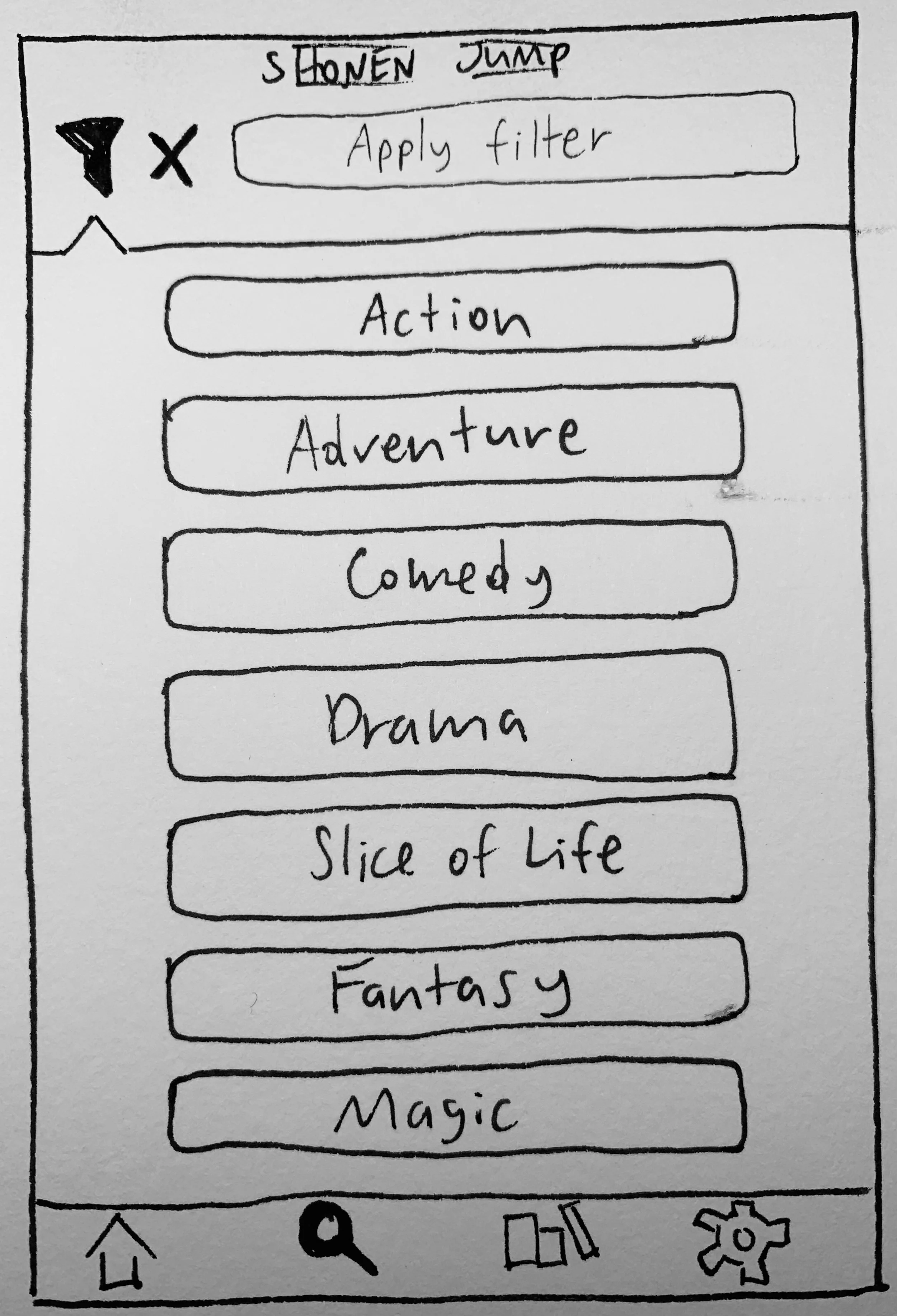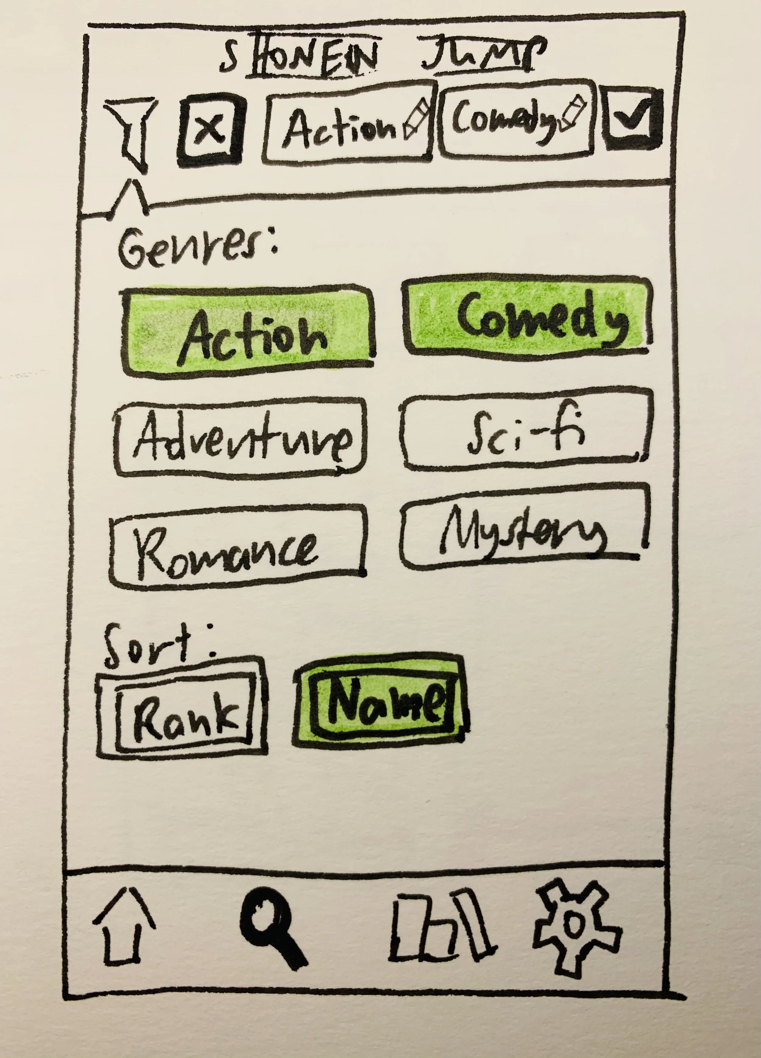 My aim was to slightly redesign and update the functionality of the mobile ui. I tasked myself to provide users with an easy ability to save manga found while browsing into a Favorites list for later viewing. Additionally, allow users to filter by as many genres as they like that incorporates the logic of inclusive rather than exclusive constraints. This means that the filter will show results for any and all manga that are tagged with the genre(s) selected.
